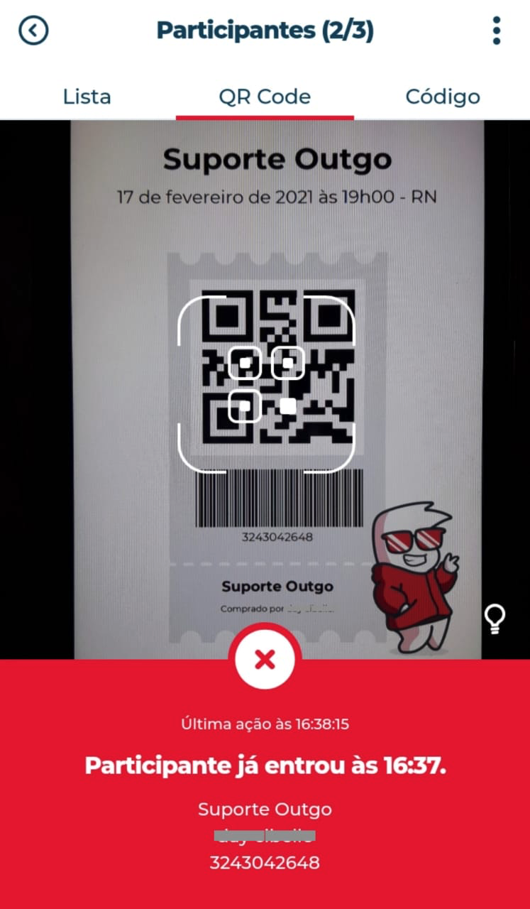 4. Caso você tente realizar o check-in de um ingresso que já foi validado, o sistema informará que o participante já entrou no evento e não realizará o check-in, conforme mensagem abaixo: