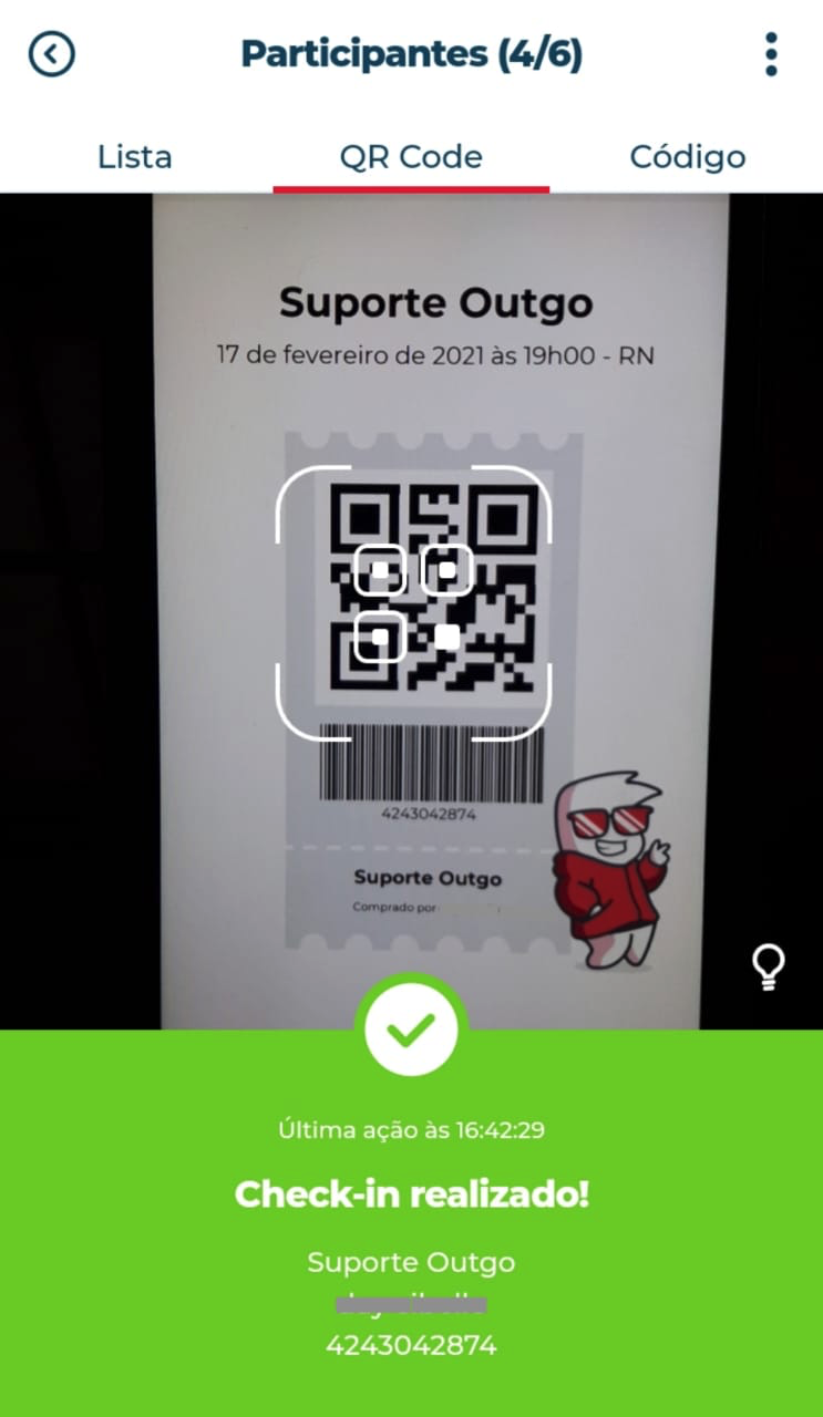 3. Se preferir, você também tem a opção de fazer a leitura do QR Code do ingresso. Para isso, basta clicar na aba "QR Code", na parte superior da tela, que abrirá a câmera. Agora basta apontar a câmera para o QR do ingresso e, assim que for validado, aparecerá a mensagem de "Check-in realizado!" com horário da validação, nome e código do ingresso;